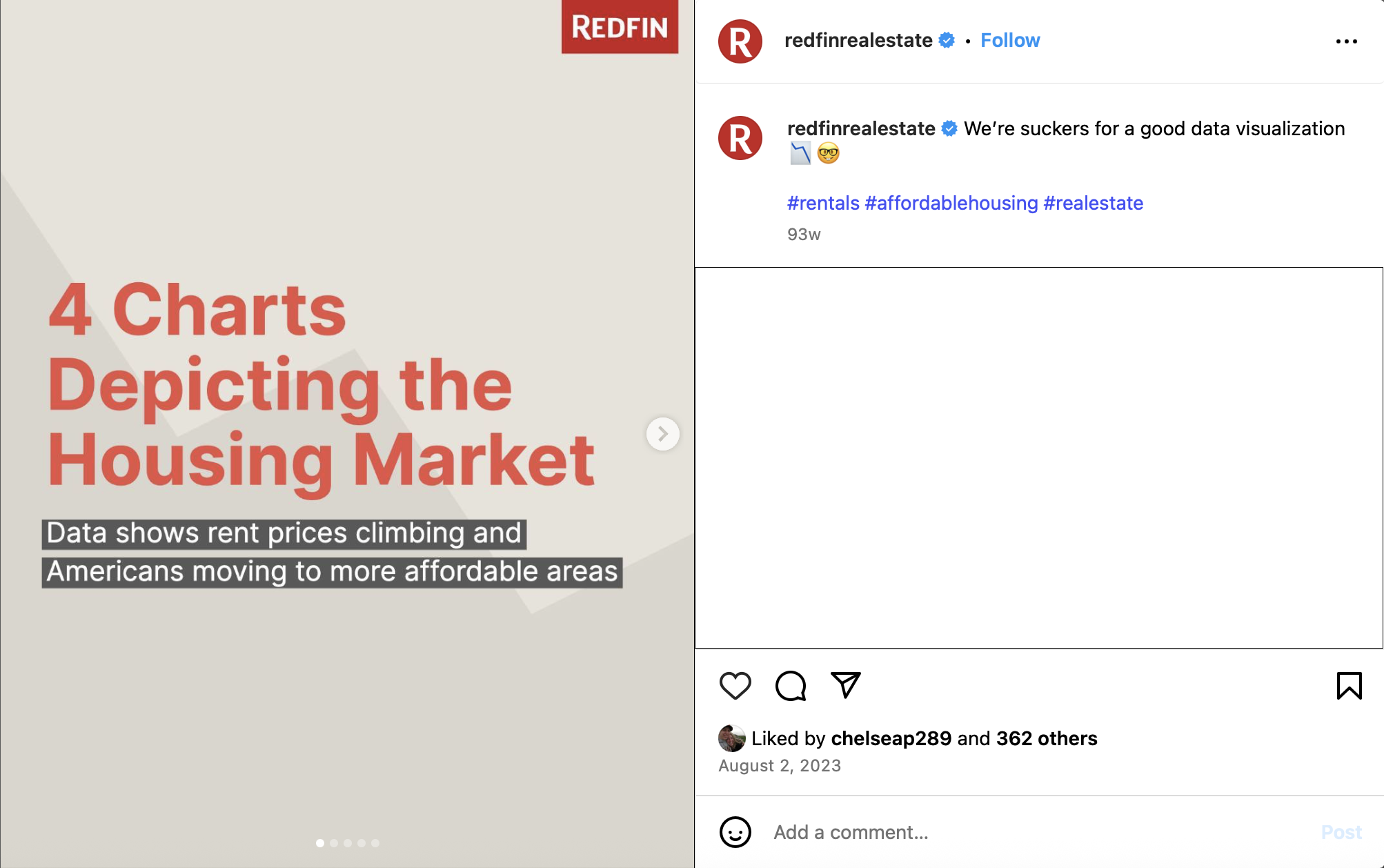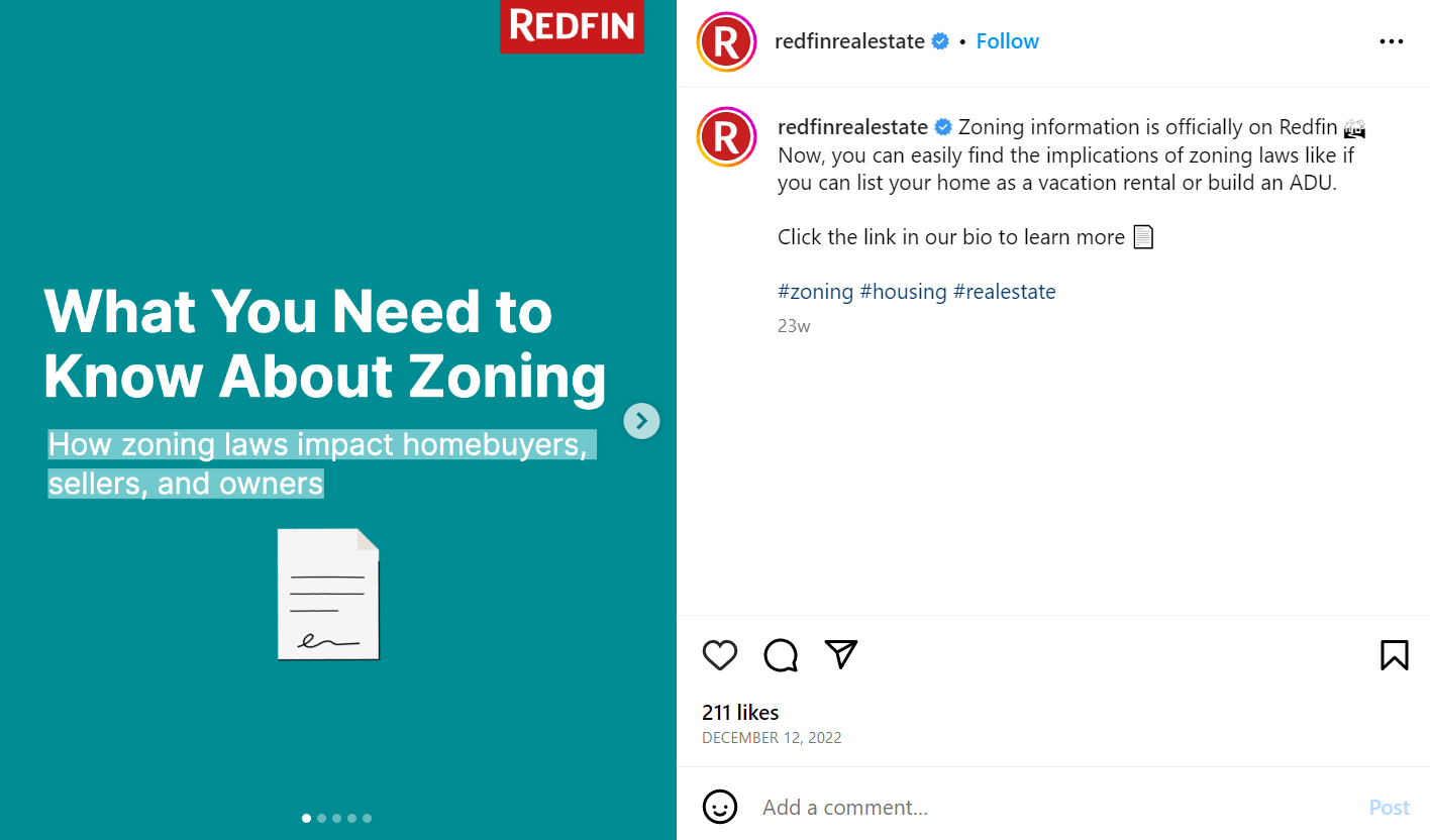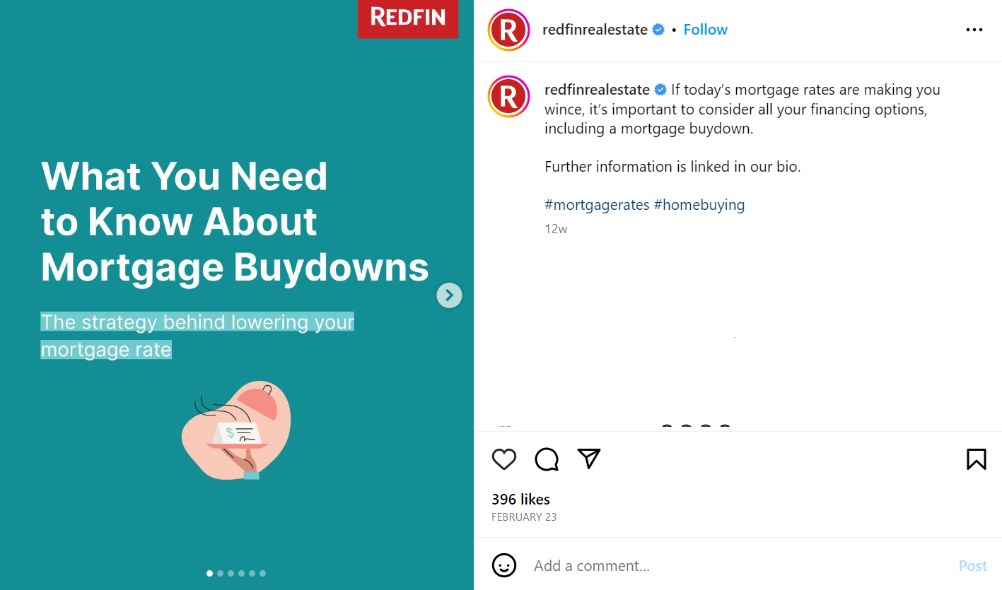Mortgage buydowns, zoning laws—most homebuyers aren’t familiar with these terms. While on the Redfin team, we used Instagram carousels as a way for us to educate audiences while positioning the company as a leading voice in the real estate market.